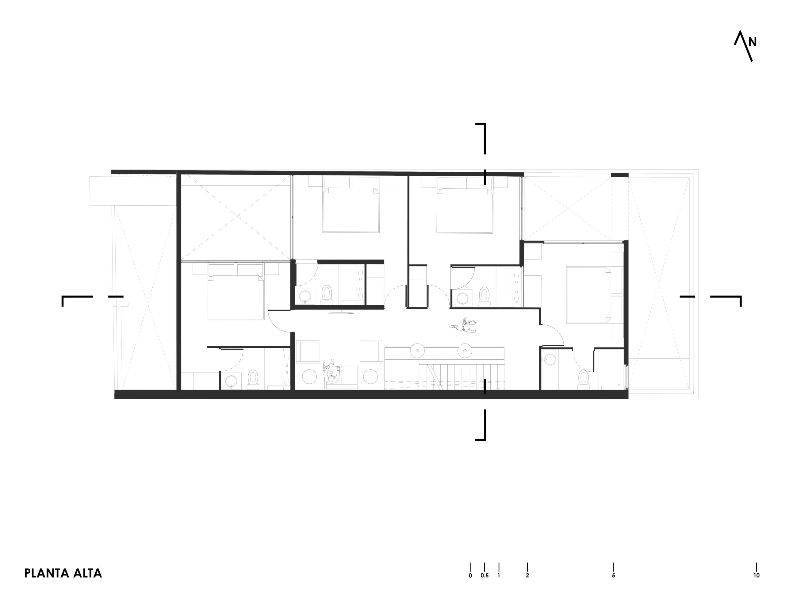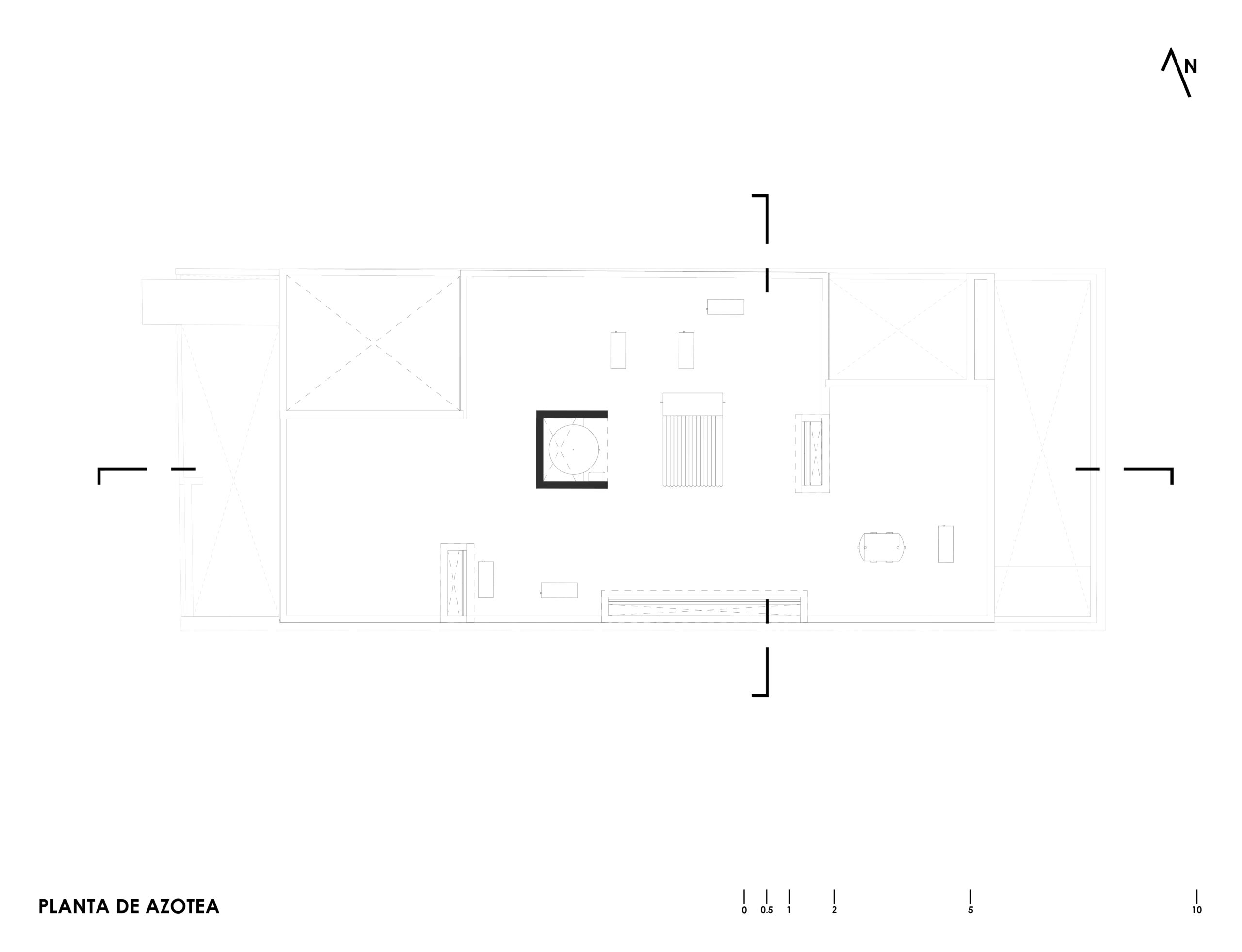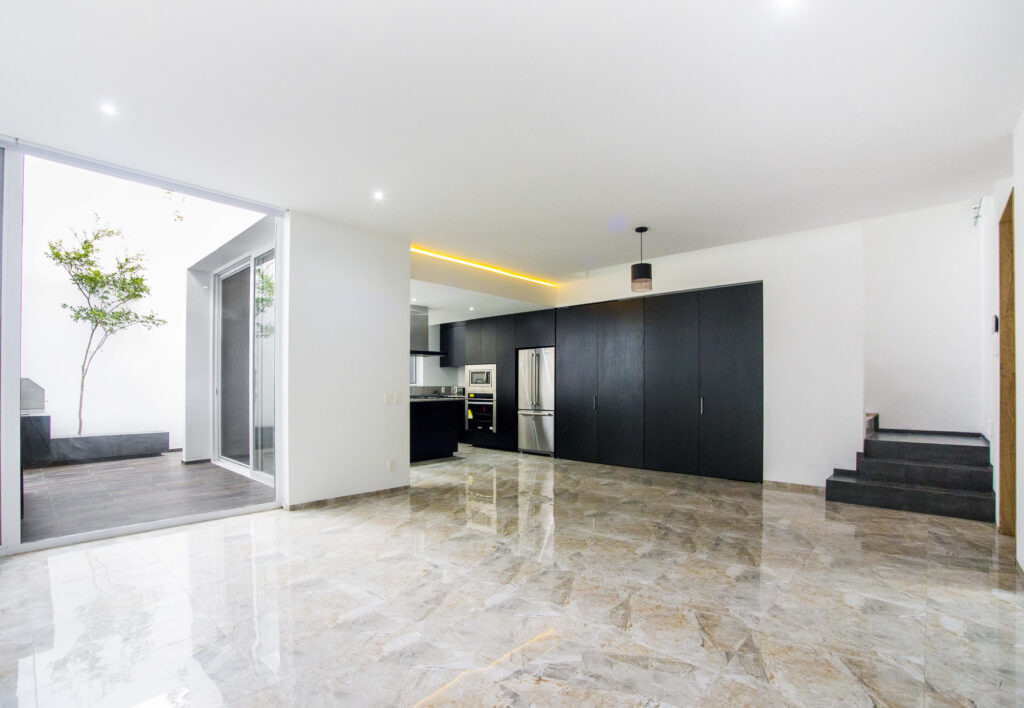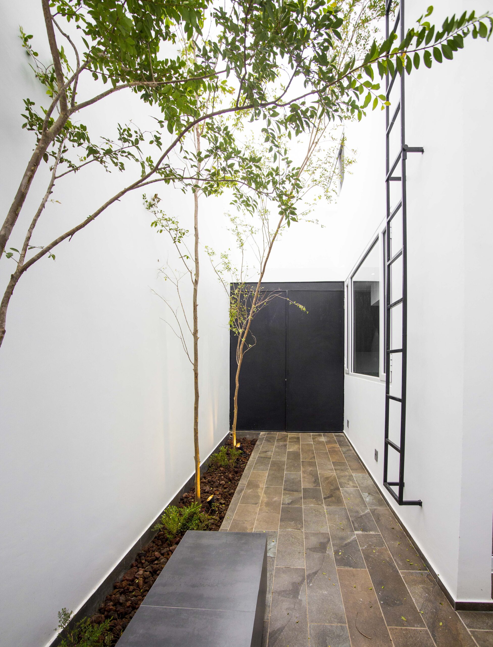 Para poder condensar en tampoco espacio 5 habitaciones, todas ellas con baño experimentamos con los volúmenes. En los patios frontal y posterior tenemos cubiertas ligeras a doble altura que crean espacios semicubiertos muy bien ventilados que desvanecen las fronteras entre “el adentro” y “el afuera” reforzados con una exquisita vegetación que filtra la vista hacia el exterior dando una fuerte sensación de apertura. Esta sensación permea hacia el interior dotándolo de una inigualable frescura, ahí nuevamente jugamos con las alturas y espacios abiertos logrando que la casa se perciba amplia y confortable a pesar del programa arquitectónico tan ambicioso y las limitaciones del terreno.