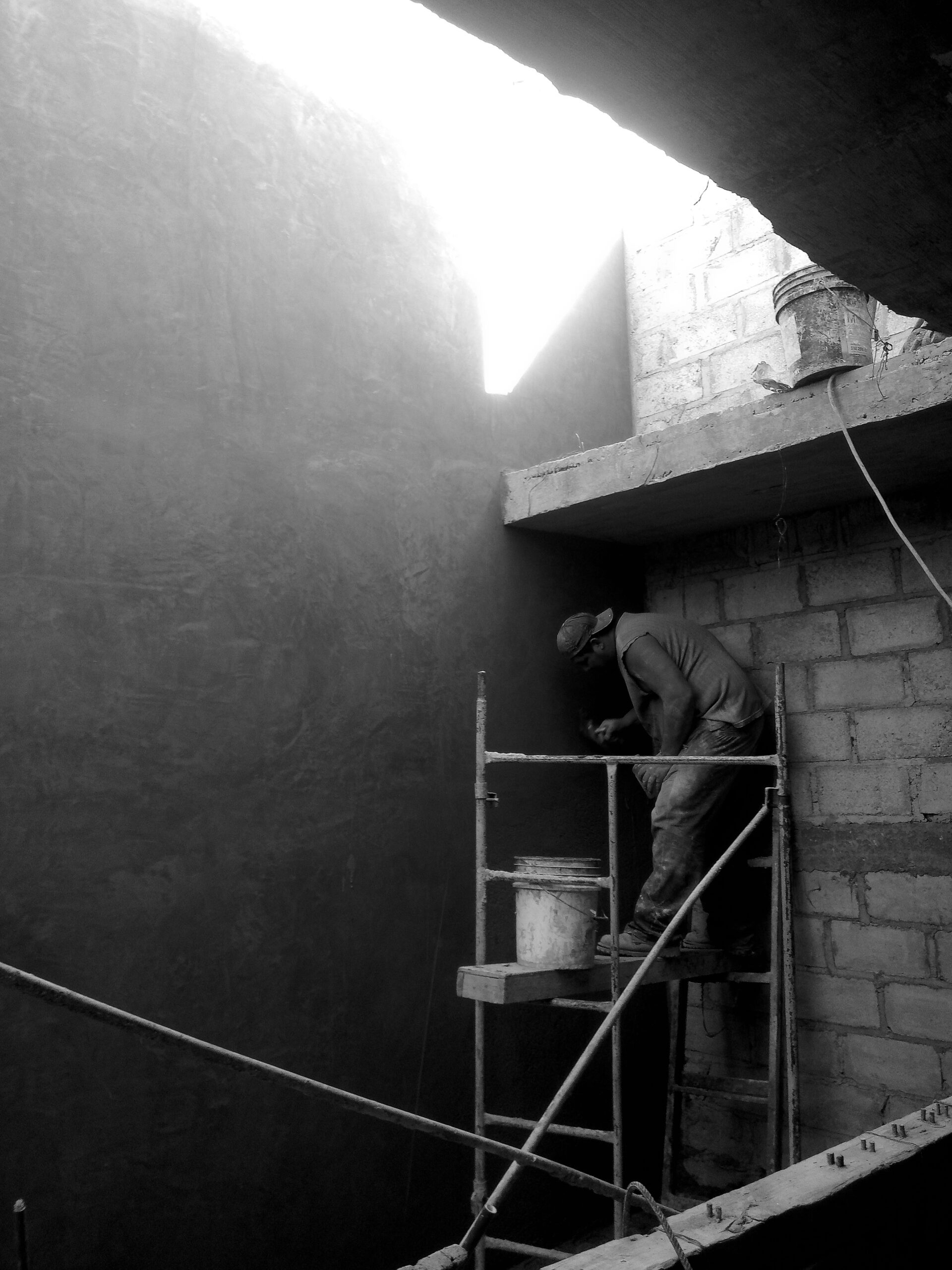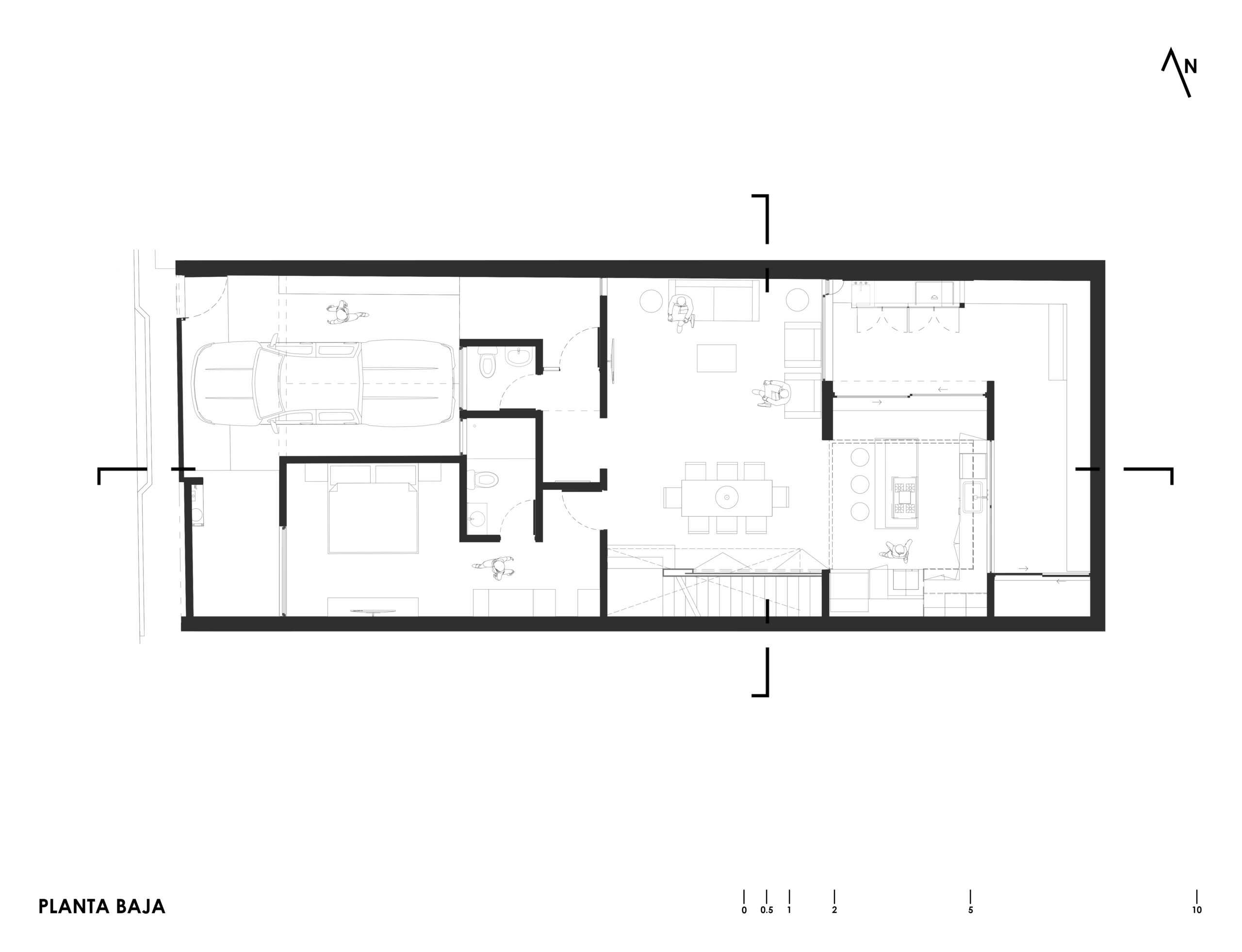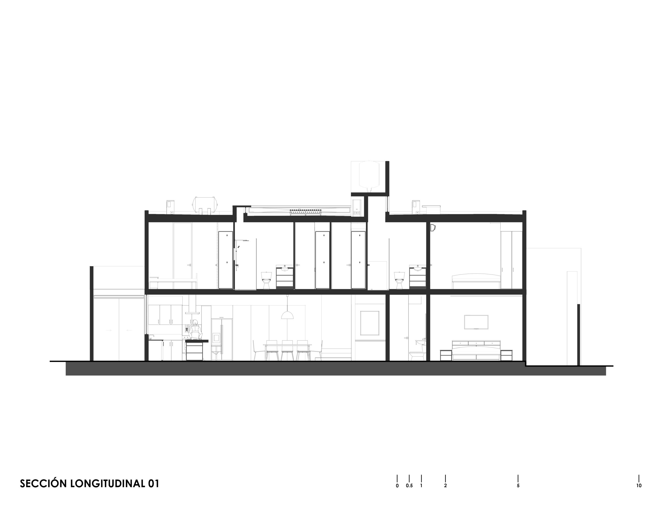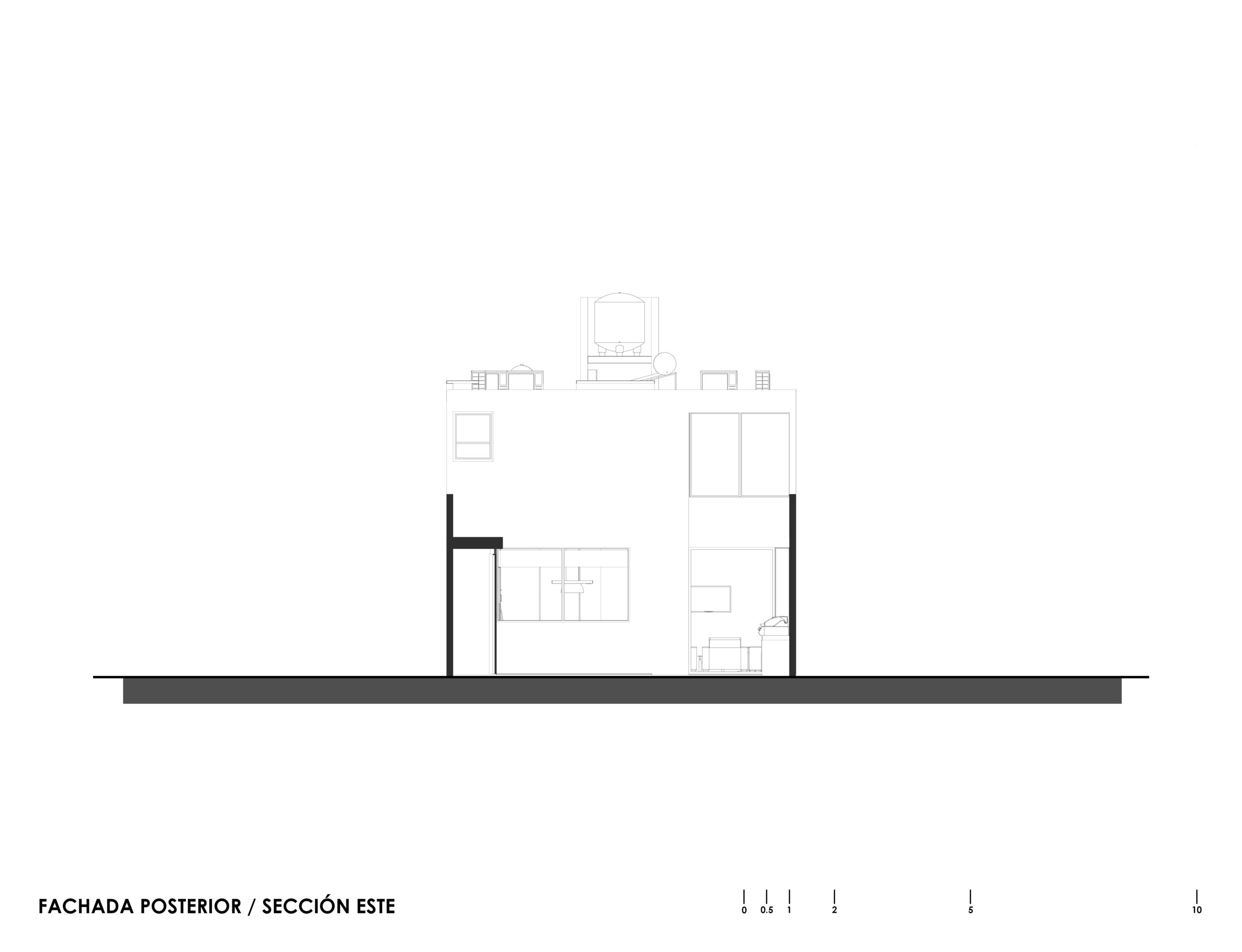 Para poder condensar en tampoco espacio 5 habitaciones, todas ellas con baño experimentamos con los volúmenes. En los patios frontal y posterior tenemos cubiertas ligeras a doble altura que crean espacios semicubiertos muy bien ventilados que desvanecen las fronteras entre “el adentro” y “el afuera” reforzados con una exquisita vegetación que filtra la vista hacia el exterior dando una fuerte sensación de apertura. Esta sensación permea hacia el interior dotándolo de una inigualable frescura, ahí nuevamente jugamos con las alturas y espacios abiertos logrando que la casa se perciba amplia y confortable a pesar del programa arquitectónico tan ambicioso y las limitaciones del terreno.